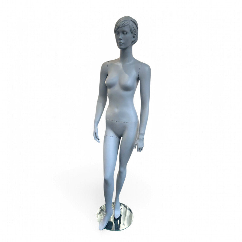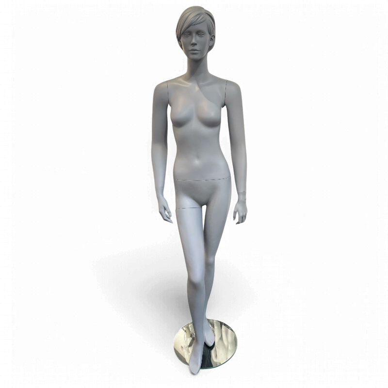 Elegant damedukke med detaljert ansikt og skulpturert hår. Denne damedukken er designet med et detaljert ansikt og skulpturert hår, som gir et realistisk og personlig uttrykk i utstillingen. Den er ideell for butikker, showrooms og messer. Mannekinen leveres med en solid fotplate og har både legg- og fotspyd, noe som gjør det mulig å presentere sko. Fremstilt i glassfiber. Mål: Høyde 180 cm. Skuldre 42 cm. Bryst 82 cm. Midje 63 cm. Hofte 87 cm. Fot: 24 cm. Matt mørkegrå glassfiber. Glass fotplate