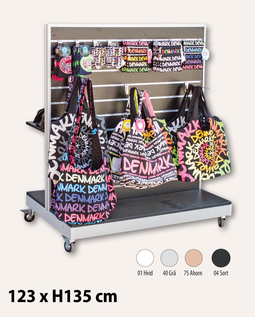 Fleksibel og mobil gondol for effektiv varepresentasjon. Denne dobbeltsidige gondolen med rillepanel er et praktisk og allsidig salgsdisplay for den profesjonelle butikken. Gondolen er bygget rundt et solidt metalramme og leveres med rillepaneler i flere farger, slik at den enkelt kan tilpasses ditt visuelle uttrykk og merkevareidentitet. Det tosidige designet gjør gondolen ideell for plassering midt på gulvet, hvor du kan presentere varer fra begge sider og maksimere salgsarealet. De integrerte hjulene sikrer enkel mobilitet, slik at du raskt og enkelt kan endre layout eller flytte inventaret ved sesongskifte, kampanjer eller rengjøring. Tophylle og beslag kan kjøpes separat hvis du ønsker ekstra fleksibilitet i varepresentasjonen. Mål: B 120 x H 135 cm Rilleavstand: 10 cm Alu-farget metalstel Sendes u samlet