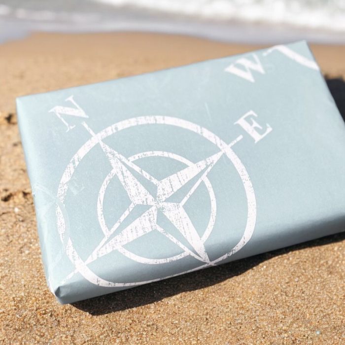 | Ideell for sommerbutikker; dette gavepapiret med maritimt tema har et lyst og dempet blått trykk på hvit kraftpapir. Papiret veier 70 g/m². Mål: B 57 cm x 175 m. Ser flott ut med jutebånd eller bastbånd. | Normalpris