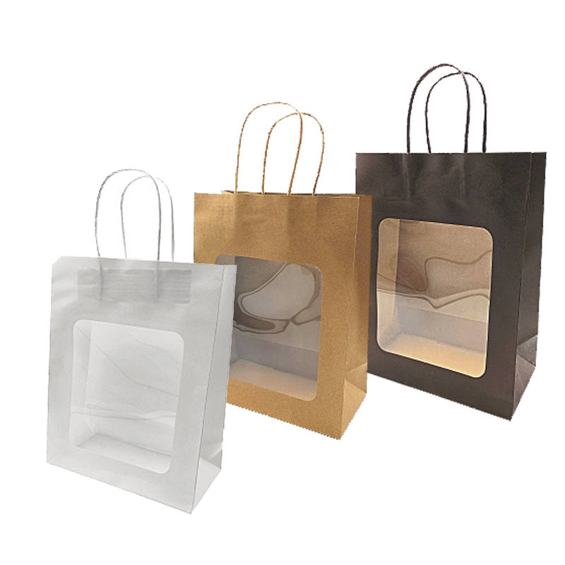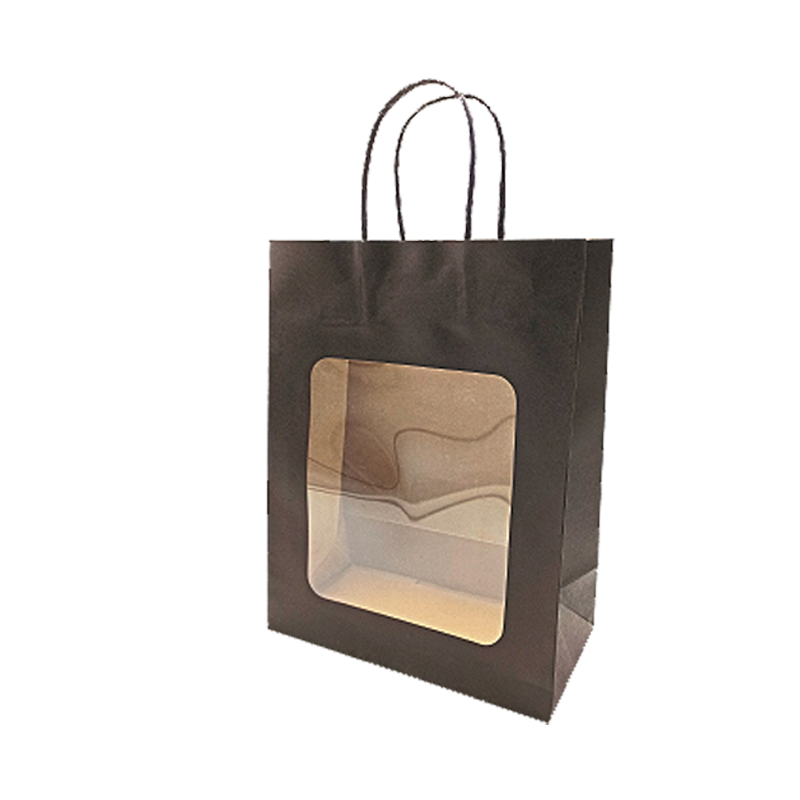 Stor papirpose med vridde håndtak. Vindusluke med avrundede hjørner. Perfekt for eksklusiv innpakning. Papirposen leveres pakket i 20 stk. B 21,5 x D 10,5 x H 27,5 cm. Svart / brunt kraftpapir. Finnes også i en mindre størrelse.