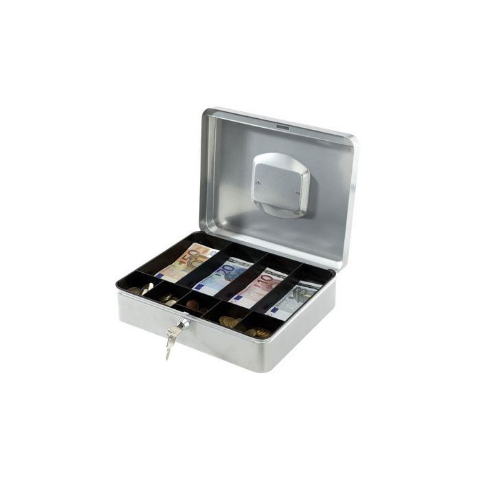 | Pengekassen er i metall med håndtak på lokket og med 1 flyttbar skuff. Skuffen er i plast med 5 rom til mynter og 4 rom til sedler. Pengekassen har også lås; 2 nøkler medfølger. Mål: 30 x 40 x H 9 cm Grå 2 nøkler | Normalpris
