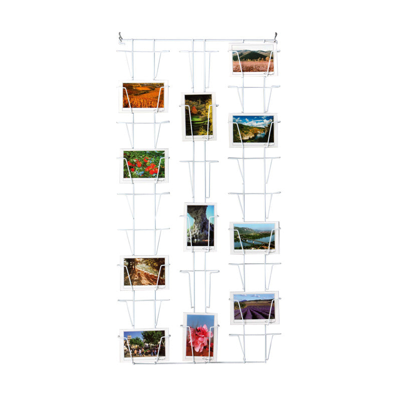 | Postkortholder i hvitt metall for veggmontering. Rammen måler 50 x 100 cm. Den kan romme opptil 24 kort: 18 liggende og 6 stående. | Normalpris
