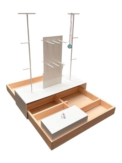 | Smykkedisplay i lyst tre og hvitt. Trebakke med løs romdeling. Metallstang med hengedisplayer i hvitt. Blokk for fremvisning og skilt-holder i hvitt. Alle deler er løse deler. Bakken kan brukes uten tilbehør. Med tilbehøret kan bakken innredes på et utall måter | Normalpris