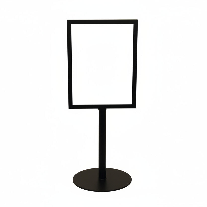Vår klassiske menykortholder i metall på en solid rund metallfot. Vår meny- eller skilt-holder passer til alle typer skilting. Enten det er laminerte skilt, skilt med plastlommer, papir eller papp, kan det settes inn i vår menykortholder. Foten har en fast høyde på 19 cm, men kan forhøyes med opptil 15 cm ved kjøp av en forlengelse. Vi anbefaler også å kjøpe plastlommer for å beskytte papirskiltet mot slitasje og smuss. Den galvaniserte modellen er spesielt egnet for utendørs salgsboder, hvor den tåler ulike værforhold.